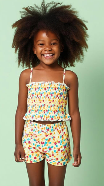 This two-piece floral short set for girls features a smocked tank top paired with comfortable matching shorts. The smocking detail offers a flexible fit while adding stylish texture. Lightweight and breathable, this set is perfect for warm weather, providing ease of movement and charming summer style for everyday wear.60% cotton 40% Polyester
